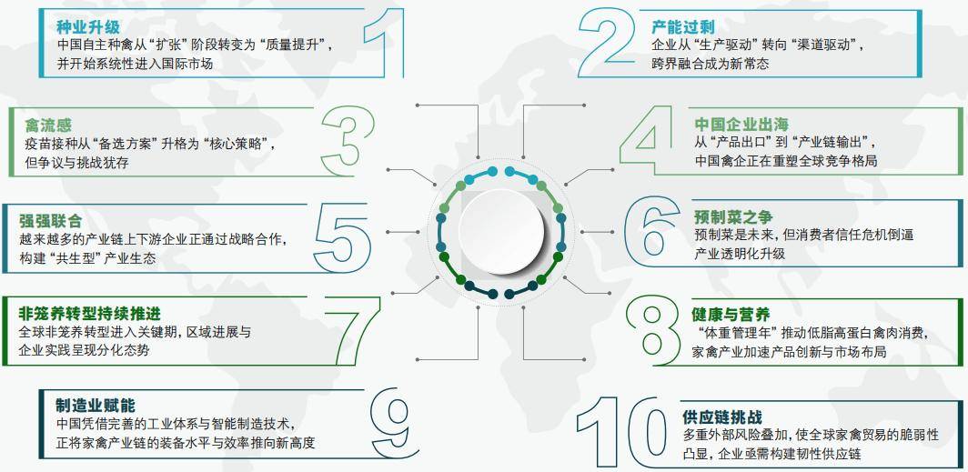 “强强结合”“跨界渠道”正帮推家禽企业建立生态合作力,正在全球市场中抢占线年,全球家禽财产正在多沉挑和中寻找新均衡。高致病性(HPAI)疫情冲击仍未完全衰退,疫苗接种成为防控策略的环节一环;中国种业正在自从立异取国际化道上加快前行,白羽肉鸡品种进一步“一带一”市场;产能过剩倒逼企业转型,渠道立异取跨界融合成为破局之道;取此同时,预制菜争议、动物福利攀升、健康养分趋向、制制业升级取供应链扰动等议题,配合勾勒落发禽财产变化的立体图景。面临复杂,家禽企业不再孤军做和,而是通过“强强结合”建立生态合作力,正在全球市场中抢占话语权。 据卓创资讯数据,2025年1~9月国内白羽肉鸡祖代种鸡自繁量为57。42万套,同比削减57。42%,但市场占比因国外引种削减反而获得了提到61。82%。此外,头部企业将成长沉心也逐步转移至品种研发。如,“圣泽901”正在1月和8月未进行更新,累计更新量仅为17。4 万套,但其新一代自研种鸡“圣泽901Plus”正在料肉比等环节目标上持续优化;“沃德188-3”通过精准适配中国胃,正在环节部位产出量实现冲破性提拔:鸡翅产量增12%、鸡爪增18%、鸡胗增17%、鸡腿增8%。正在“走出去”方面,2025年4月,圣农集团取巴基斯坦一家农业企业签订手艺合做和谈,正在本地扶植“圣泽901”父母代种鸡场,估计2026年投产。同年6月,新广农牧的“广明2号”种蛋初次出口至乌兹别克斯坦,标记着中国种禽正式进入中亚市场。国度肉鸡财产手艺系统首席科学家赵桂苹暗示:“白羽肉鸡的国际化推广为全球农业财产链供给了‘中国方案’,中国种源无望正在中东甚至全球市场占领更主要的地位,帮力建立多元化、可持续的全球粮食平安系统。”2025年,中国度禽行业正派历一场由产能过剩激发的布局性调整。据国度统计局数据显示,2025年上半年全国禽肉产量同比增加4。2%,而消费端增速仅为2。1%,供需失衡导致市场价钱持续承压。正在这一布景下,保守依赖规模扩张的增加模式难认为继,部门头部企业起头将计谋沉心转向渠道立异取价值链沉塑,试图正在激烈的市场所作中斥地新的增加径。为消化过剩产能、提拔产物附加值,一批龙头企业起头积极结构终端渠道,以至斗胆跨界,进军餐饮取轻食范畴。2025年3月,双汇成长旗下“双汇厨房”品牌推出首家“鸡专家·轻食工坊”,从打以鸡胸肉为焦点的轻食套餐,精准定位都会白领取健身人群,自2024年10月起,新一轮HPAI疫情持续正在北半球取南半球的家禽群、野生鸟类及哺乳动物中扩散,新发疫情次数呈上升态势。正在此布景下,加速推进HPAI疫苗接种历程。目前,中国、墨西哥、埃及和越南等国已将HPAI疫苗纳入常规免疫法式;法国对贸易鸭实施强制防止性HPAI疫苗接种;荷兰于2025年3月10日正式启动蛋鸡HPAI疫苗接种,成为欧盟首个为蛋鸡接种HPAI疫苗的国度;意大利等国正进行候选HPAI疫苗的田间试验;南非近期颁布发表推进HPAI免疫策略;美国也正在制定家禽HPAI疫苗接种打算。近年来,中国度禽财产的全球化历程已从规模扩张迈向布局升级。海关总署数据显示,同比增加近37%,净增约24万吨,创下近十年新高。正在出口规模扩大的同时,布局也持续优化,品类从晚期的不脚30类扩展至35类,显示出中国度禽财产正在国际市场上分析合作力的提拔。进入2025年,中国企业的出海模式送来主要转型,从单一产物商业转向全财产链的系统性输出。2025年10月,万洲国际通过旗下子公司Morliny Foods完成对高端食物制制商Wolf Essgenuss GmbH的收购,此举不只强化了其正在欧洲肉成品市场的结构,更彰显了中国企业正在高附加值范畴的计谋野心。2025年,家禽财产加快步入整应时代。面临复杂多变的全球市场取压力,企业不再成长的保守径,而是通过本钱整合、手艺共享取资本协同,建立更具韧性取合作力的财产共生系统。全球层面的财产链整合持续深化。1月,食物加工设备巨头JBT取Marel(马瑞奥)颁布发表归并为JBT Marel,成为全球食物饮料加工处理方案的新领军者。5月,巴西卵白巨头Marfrig取BRF告竣归并和谈,成立新实体MBRF,估计年营收达1520亿雷亚尔,营业笼盖117个国度,年产能冲破800万吨,成为南半球最大的分析性卵白质企业。6月,诺和新元完成对帝斯曼-芬好心饲料酶联盟营业的收购,进一步强化其正在动物养分范畴的全链条结构。7月,KKR以约13亿澳元收购最大鸡肉出产商ProTen,后者的鸡肉年产量超1。6亿羽,占领家禽市场25%的份额。 2025年,预制菜市场正在争议中持续扩大规模。据《2025中国预制菜行业成长演讲》显示,2024年预制菜市场规模已达5466亿元,同比增加5。83%。估计2025年国内市场规模将冲破6000亿元,2026年无望升至万亿元级别。然而,9月10日西贝董事长贾国龙取罗永浩就预制菜价值展开的公开辩说,将行业推向核心。这场辩论深刻了消费者对食物实正在性、通明度的火急需求,促使家禽财产从头审视成长径。争议的焦点正在于消费者对知情权取选择权的强烈。世界农场动物福利协会(CIWF)发布的《蛋鸡财产非笼养转型的贸易价值》演讲指出,全球蛋鸡财产正派历从保守笼养向非笼养模式的系统性转型。这一趋向由消费者需求、政策律例取企业可持续成长计谋配合鞭策,展示出动物福利取贸易价值的双沉提拔。演讲数据显示,全球已有跨越2500项非笼养鸡蛋采购许诺,此中欧洲转型率领先(80%),美国(73%)和亚太地域(57%)紧随